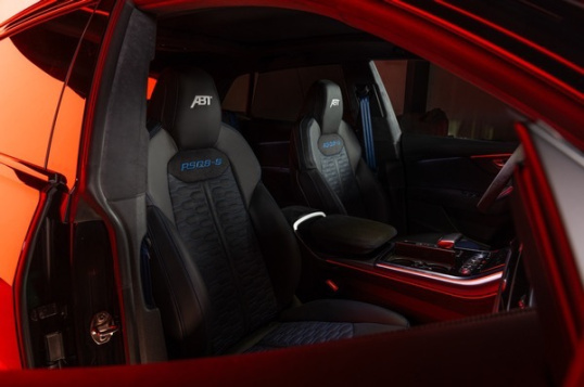 Optisch wird die zusätzliche Leistung durch ein stimmiges Aerodynamik-Paket unterstrichen. Ein Frontspoiler aus mattem Sichtcarbon betont die Frontpartie, während eine ABT Radhausentlüftung an der Vorderachse in Schwarz glänzend mit integrierter Emblemplakette RSQ8-S für einen markanten Auftritt sorgt.